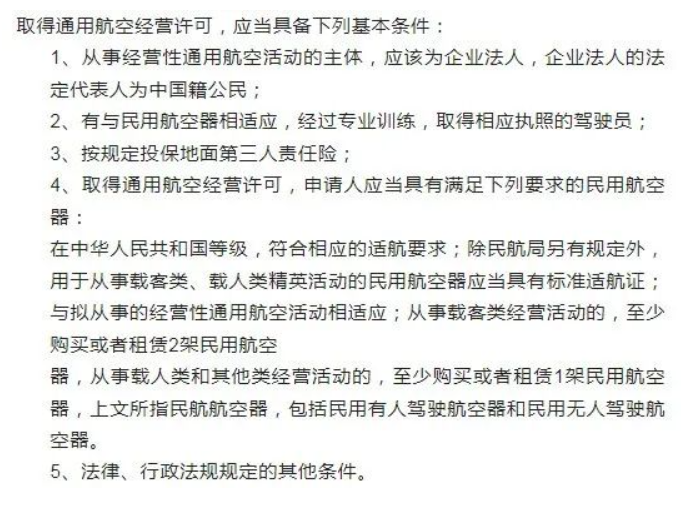 1.《中华人民共和国民用航空法》(1995年10月30日中华人民共和国第6号主席令,自1996年3月1日起施行)。2.《通用航空经营许可管理规定》(2020年8月4日交通运输部令2020年第18号公布,2021年1月1日起施行)。
